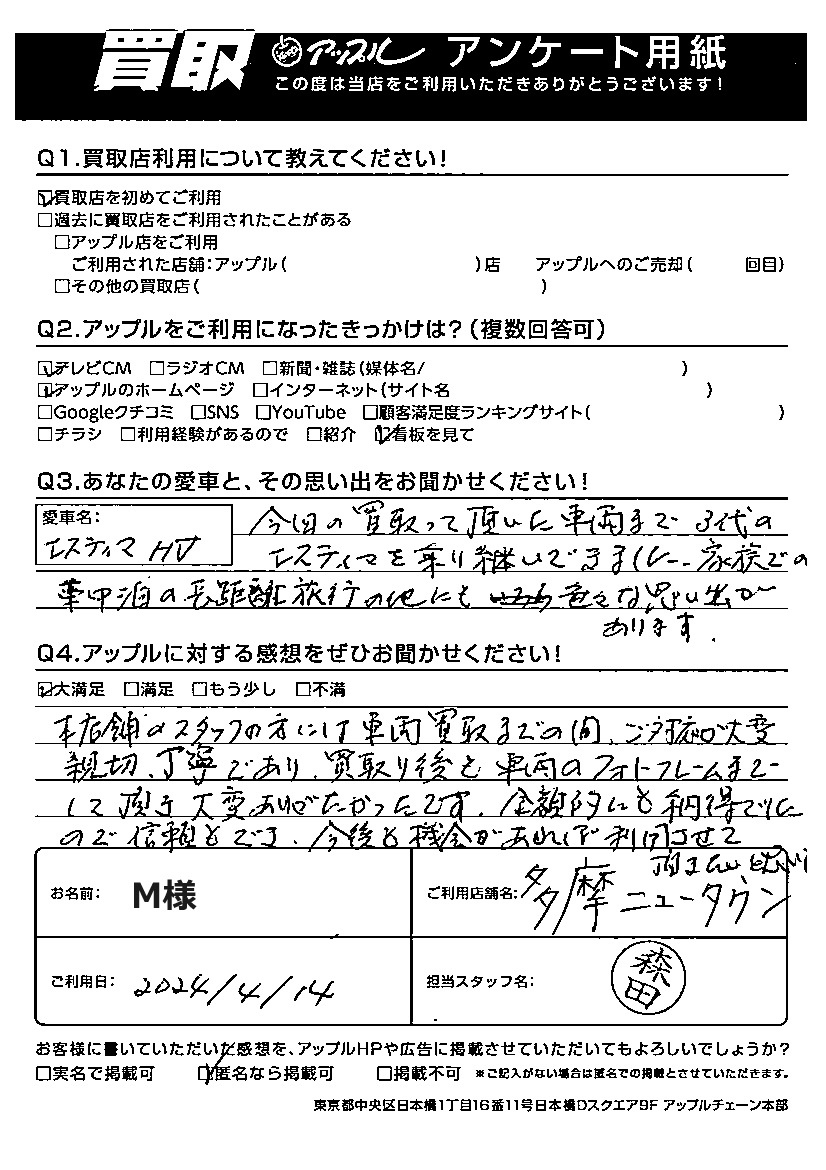 M様 車名:トヨタ エスティマハイブリッド