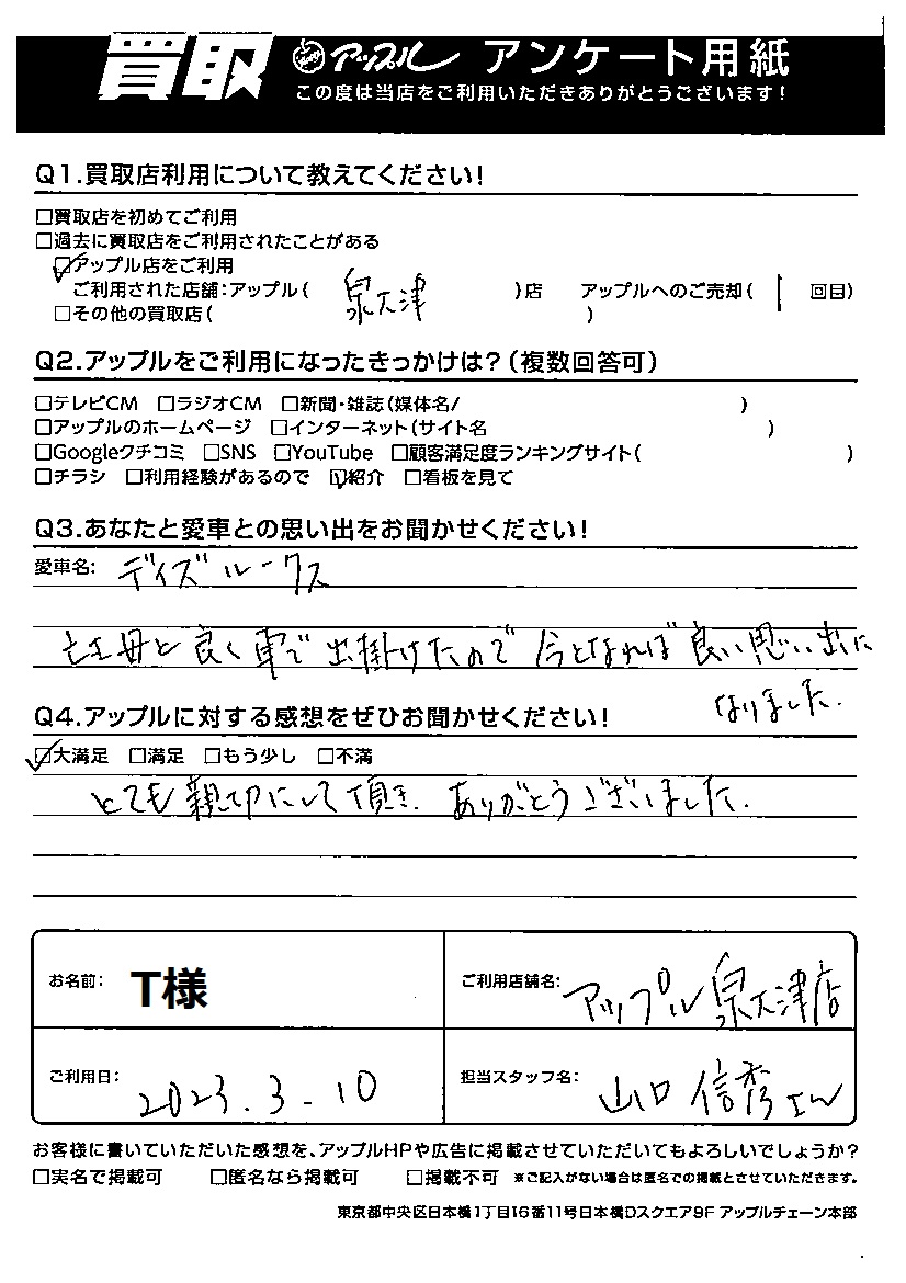 お車のご相談・ 査定だけでもOK! カンタン 入力 30秒 アップルがブランド買取始めました! お電話でも受付中! 受付時間9:00~18:00 0725-23-7750 お車のご相談・ 査定だけでもOK! カンタン 入力 30秒 アップルがブランド買取始めました! お電話でも受付中! 受付時間9:00~18:00 0725-23-7750 アップルがブランド買取始めました! お電話でも受付中! 受付時間9:00~18:00 0725-23-7750 店舗情報 在庫車 スタッフ紹介 ブログ お客様の声 キャンペーン お得 無料査定 click お客様の声 ご記入日: 2023/03/10 T様 Q:あなたと愛車との思い出をお聞かせください!愛車名:デイズルークス亡き母と良く出掛けたので今となれば良い思い出になりました。Q:アップルに対する感想をぜひお聞かせください!大満足とても親切にして頂き、ありがとうございました。 前へ 次へ お客様の声一覧を見る