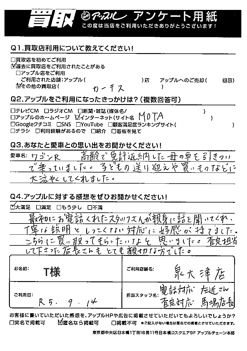 T様 車名:スズキ ワゴンR