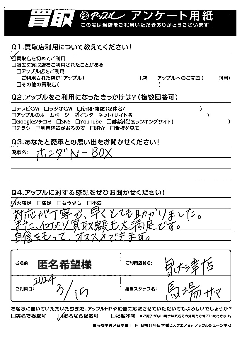 お車のご相談・ 査定だけでもOK! カンタン 入力 30秒 アップルがブランド買取始めました! お電話でも受付中! 受付時間9:00~18:00 0725-23-7750 お車のご相談・ 査定だけでもOK! カンタン 入力 30秒 アップルがブランド買取始めました! お電話でも受付中! 受付時間9:00~18:00 0725-23-7750 アップルがブランド買取始めました! お電話でも受付中! 受付時間9:00~18:00 0725-23-7750 店舗情報 在庫車 スタッフ紹介 ブログ お客様の声 キャンペーン お得 無料査定 click お客様の声 ご記入日: 2024/03/15 匿名希望様 車名:ホンダ N-BOX Q:アップルに対する感想をぜひお聞かせください!大満足対応が丁寧で、早くとても助かりました。また、何より買取額も大満足です。自信をもって、オススメできます。 前へ 次へ お客様の声一覧を見る