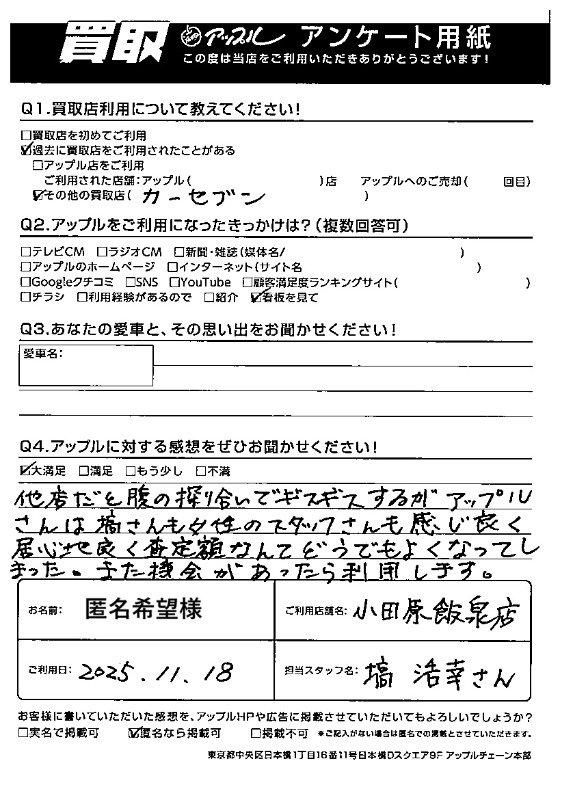 アップルをご利用いただいたお客様から、次のような感想をいただいております。