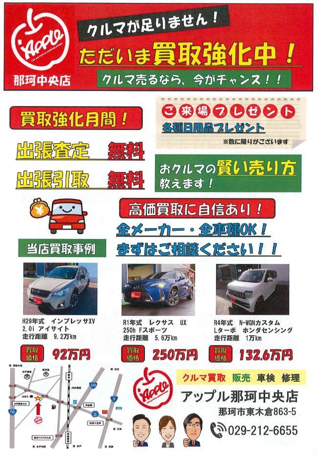 お車のご相談・ 査定だけでもOK! カンタン 入力 30秒 アップルがブランド買取始めました! お電話でも受付中! 受付時間9:30~18:30 029-212-6655 お車のご相談・ 査定だけでもOK! カンタン 入力 30秒 アップルがブランド買取始めました! お電話でも受付中! 受付時間9:30~18:30 029-212-6655 アップルがブランド買取始めました! お電話でも受付中! 受付時間9:30~18:30 029-212-6655 店舗情報 在庫車 スタッフ紹介 ブログ お客様の声 キャンペーン 無料査定 click [ 未分類 ] 2024/03/12 (火) 13:31 【今がチャンス】買取強化月間です! アップル那珂中央店です!4月1日時点のお車の所有者に自動車税が課税になります。当店では廃車費用などはいただいておりません!!「こんな状態だから金額がつくわけない」とあきらめる前に、、ぜひとも一度ご相談くださいませ。ただいま買取強化月間中となります。どんな車も買い取りますのでご相談お待ちしております!!!お気軽にお問い合わせください♪ 2024-03-12 13:31:30 新しい記事へ 古い記事へ 最新記事 2026ゴールデンウィークの営業についてプロボックスのおはなし ②アルトがあるとです(博多弁)キッチンカー 入庫しました☆プロボックスの人気の秘密に迫る 店舗情報に戻る 月別アーカイブ 2026年04月(3)2026年03月(5)2026年02月(4)2026年01月(2)2025年12月(3)2025年11月(5)2025年10月(3)2025年09月(1)2025年08月(2)2025年06月(1)2024年12月(3)2024年08月(1)2024年07月(2)2024年06月(1)2024年04月(1)2024年03月(1)2024年01月(2)2023年12月(3)2023年10月(1)