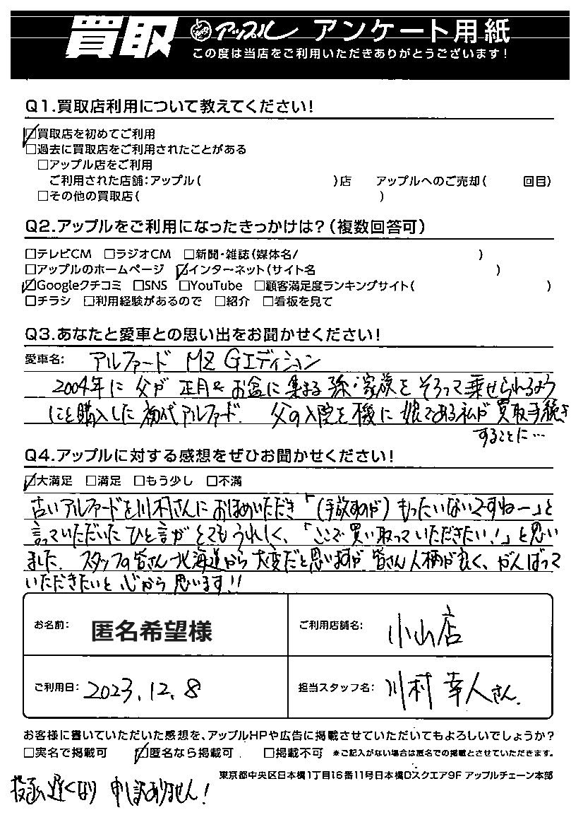 古いアルファードを川村さんにおほめいただき、「(手放すのが)もったいないですねー」と言っていただいたひと言がとてもうれしく、「ここで買い取っていただきたい!」と思いました。