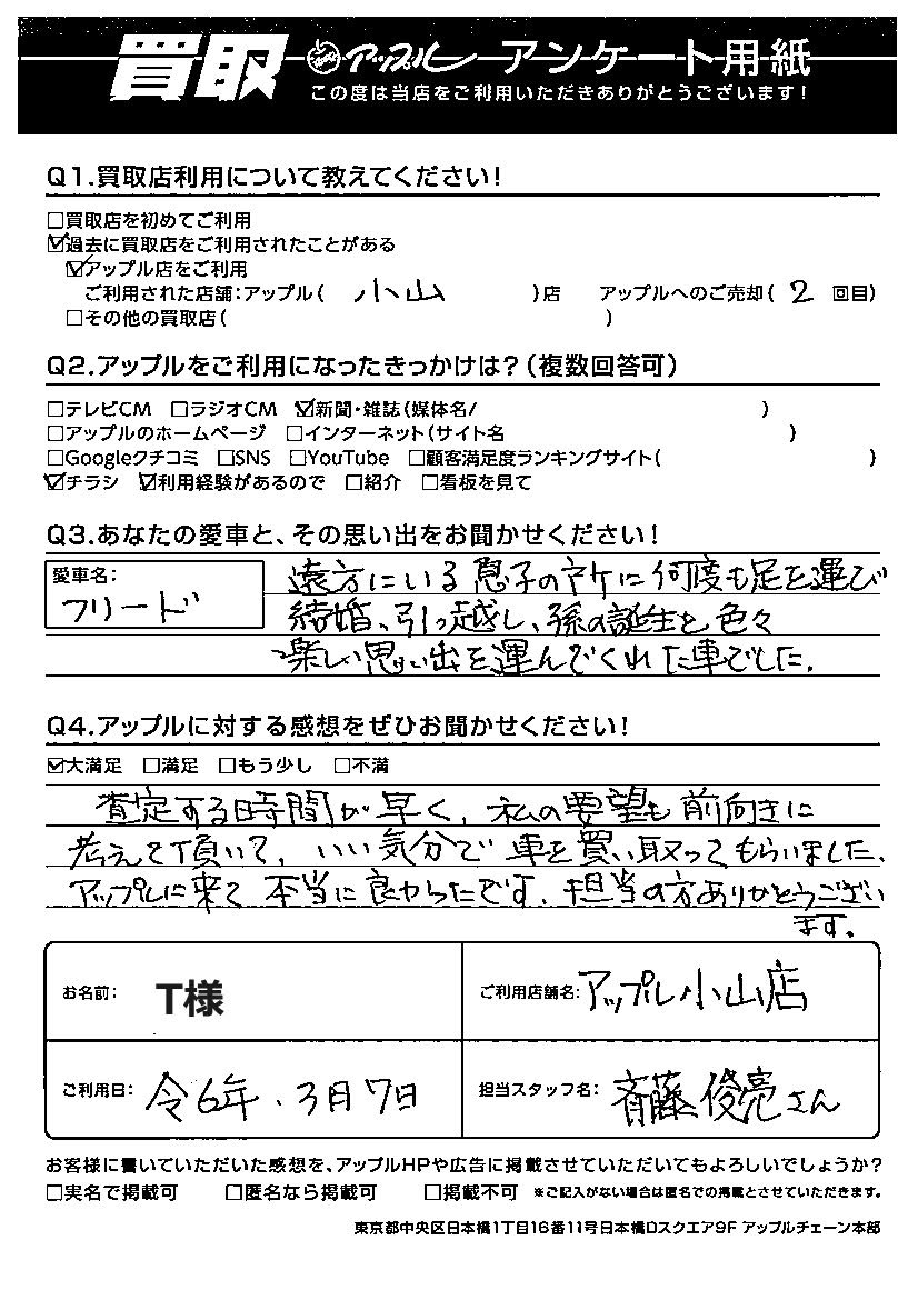 査定する時間が早く、私の要望も前向きに考えて頂いて、いい気分で買い取ってもらいました。