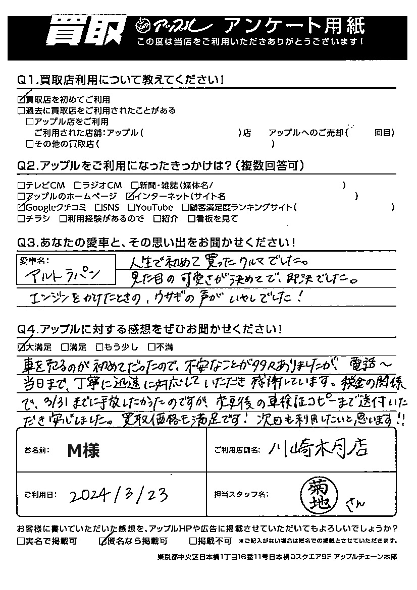 M様 車名:スズキ アルトラパン ラパン(アルト)