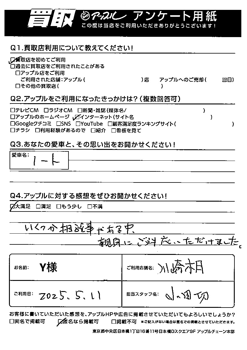 お車のご相談・ 査定だけでもOK! カンタン 入力 30秒 アップルがブランド買取始めました! お電話でも受付中! 受付時間10:00~19:00 0078-6019-6009 お車のご相談・ 査定だけでもOK! カンタン 入力 30秒 アップルがブランド買取始めました! お電話でも受付中! 受付時間10:00~19:00 0078-6019-6009 アップルがブランド買取始めました! お電話でも受付中! 受付時間10:00~19:00 0078-6019-6009 店舗情報 在庫車 スタッフ紹介 ブログ お客様の声 キャンペーン 無料査定 click お客様の声 ご記入日: 2025/05/11 Y様 車名:日産 ノート ご利用日:2025年5月11日 担当:小田切アップルに対する感想をぜひお聞かせください!いくつか相談事がある中、親身にご対応いただけました。 前へ 次へ お客様の声一覧を見る