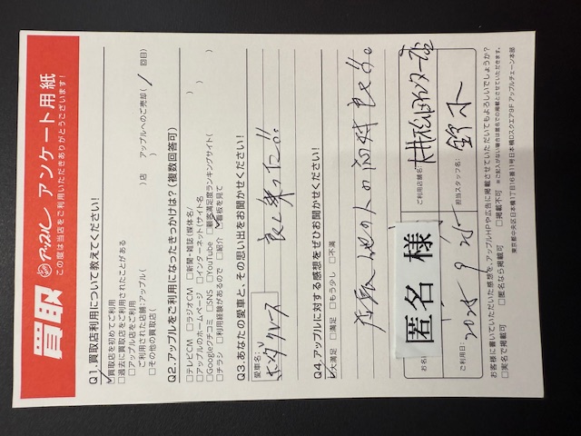 お車のご相談・ 査定だけでもOK! カンタン 入力 30秒 アップルがブランド買取始めました! お電話でも受付中! 受付時間10:00~18:00 0120-626-123 お車のご相談・ 査定だけでもOK! カンタン 入力 30秒 アップルがブランド買取始めました! お電話でも受付中! 受付時間10:00~18:00 0120-626-123 アップルがブランド買取始めました! お電話でも受付中! 受付時間10:00~18:00 0120-626-123 店舗情報 在庫車 スタッフ紹介 ブログ お客様の声 キャンペーン 無料査定 click お客様の声 ご記入日: 2025/09/25 I様 車名:ホンダ グレイス Q3.あなたの愛車と、その思い出をお聞かせください!良く乗った!Q4.アップルに対する感想を是非お聞かせください!店長他の人の対応良!! 前へ 次へ お客様の声一覧を見る