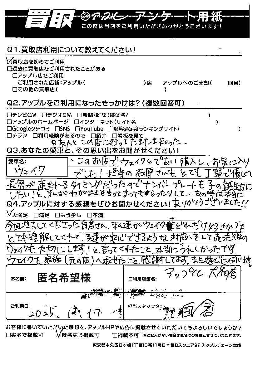 このお店でウェイクとであい購入し、お気に入りでした!担当の石原さんもとても丁寧で優しくて長男が産まれるタイミングだったのでナンバープレートも子の誕生日にしたい!と、私がわがままを言ってまってもらったりして・・・。あの時は本当にありがとうございました!!