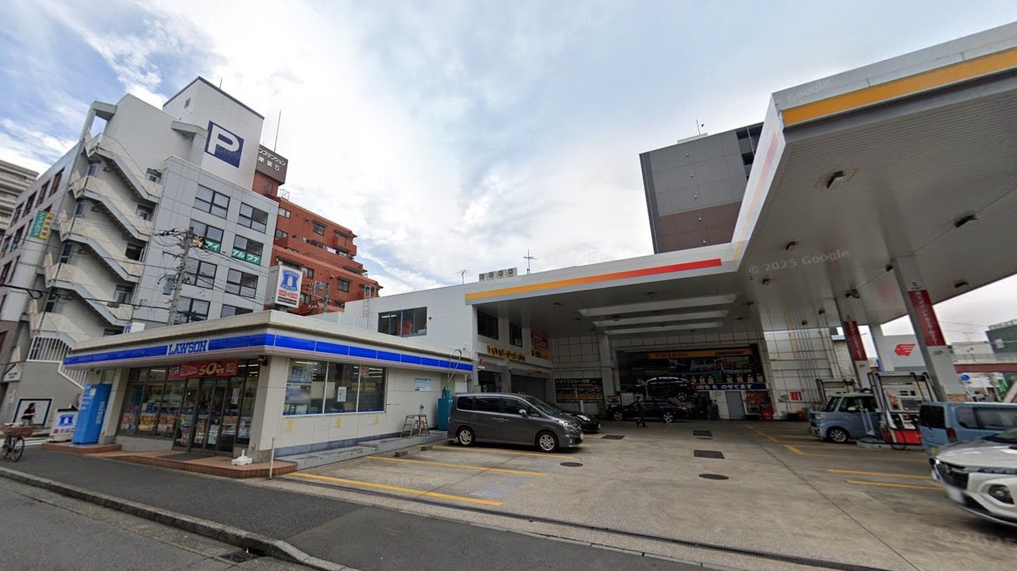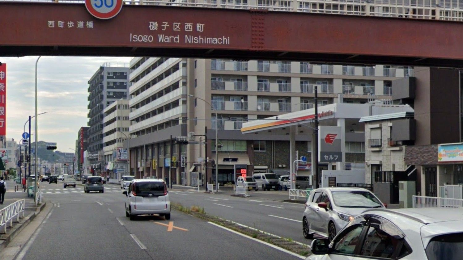国道16号の磯子方面から【八幡橋】を渡って、【磯子区西町歩道橋】をすぎて、【根岸小学校入口】の交差点を右折、ローソン併設のガソリンスタンド内です。